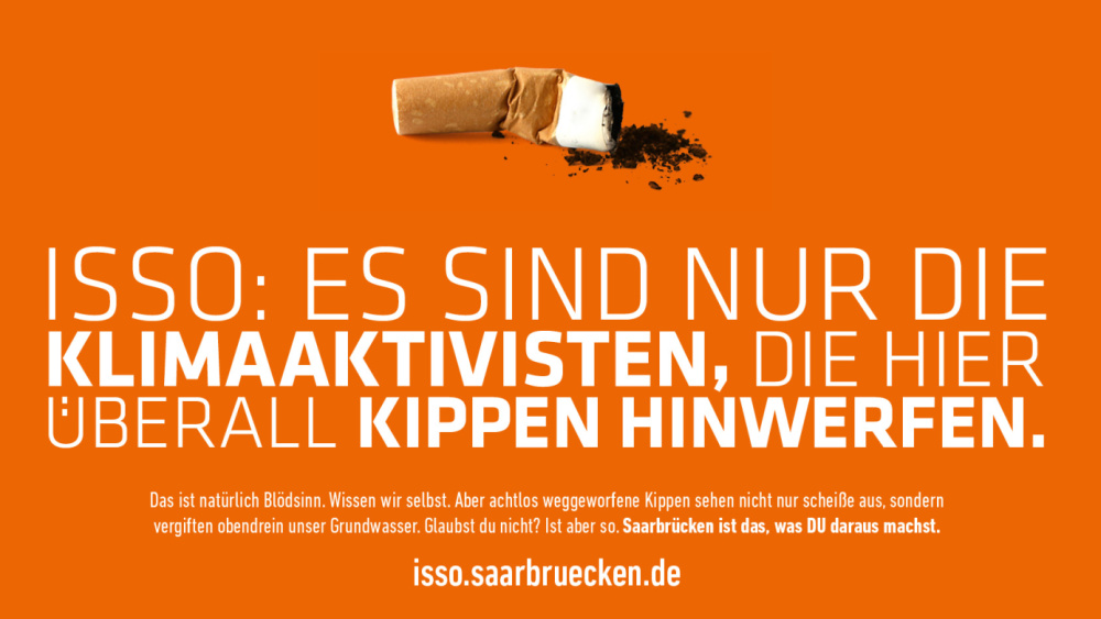 Das ist natürlich Blödsinn. Wissen wir selbst. Aber achtlos weggeworfene Kippen sehen nicht nur scheiße aus, sondern vergiften obendrein unser Grundwasser. Glaubst du nicht?! Ist aber so. Saarbrücken ist das, was DU draus machst.
