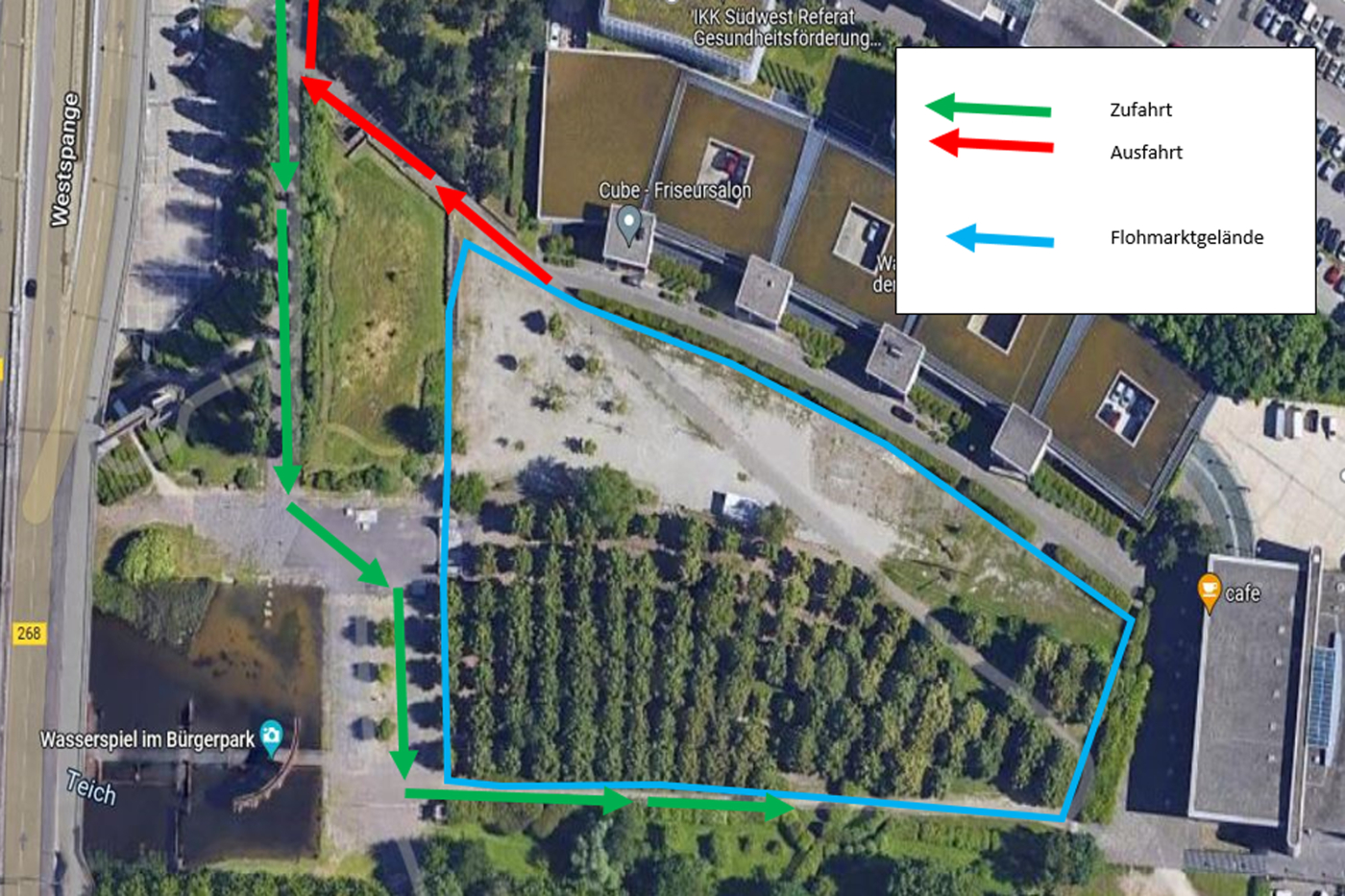 Nur ab einer Standlänge ab 6 Metern darf ein Fahrzeug hinter dem Stand geparkt werden. Bei kleineren Ständen und weiteren Fahrzeugen kann das Parkhaus unter der Westspange genutzt werden.