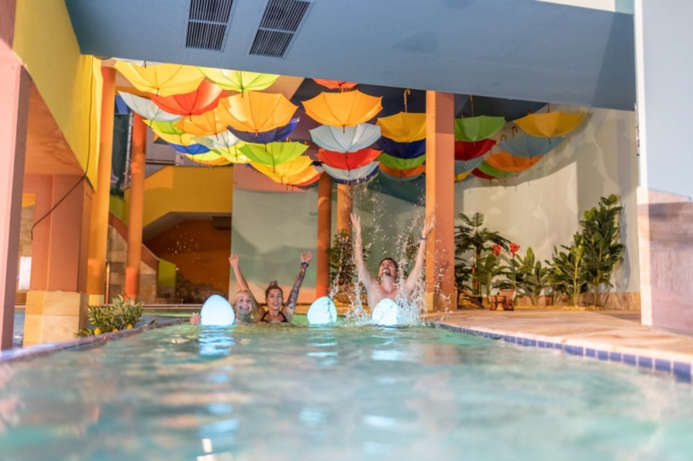 Die neu gestaltete Badewelt in Saarbrücken vermittelt durch tropische Bepflanzung, farbenfrohe Akzente und der beliebten Poolbar ein karibisches Flair.