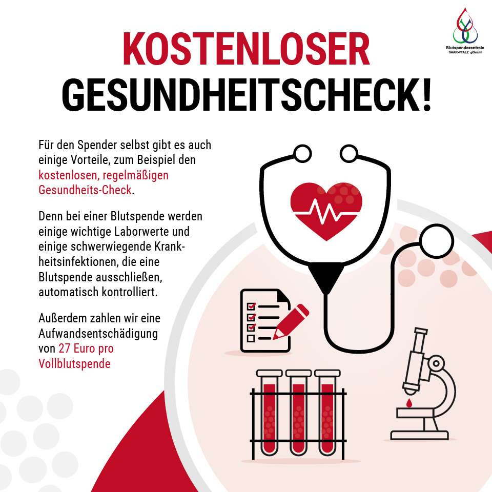 Alle zwei Jahre erfolgt ein erneuter kostenloser ärztlicher Gesundheits-Check im Rahmen der Spenderuntersuchung. Bereits nach der zweiten Spende gibt es einen persönlichen Blutspenderpass. Außerdem gibt es jedes Mal eine Aufwandsentschädigung über 25,57 Euro bei Vollblutspenden.