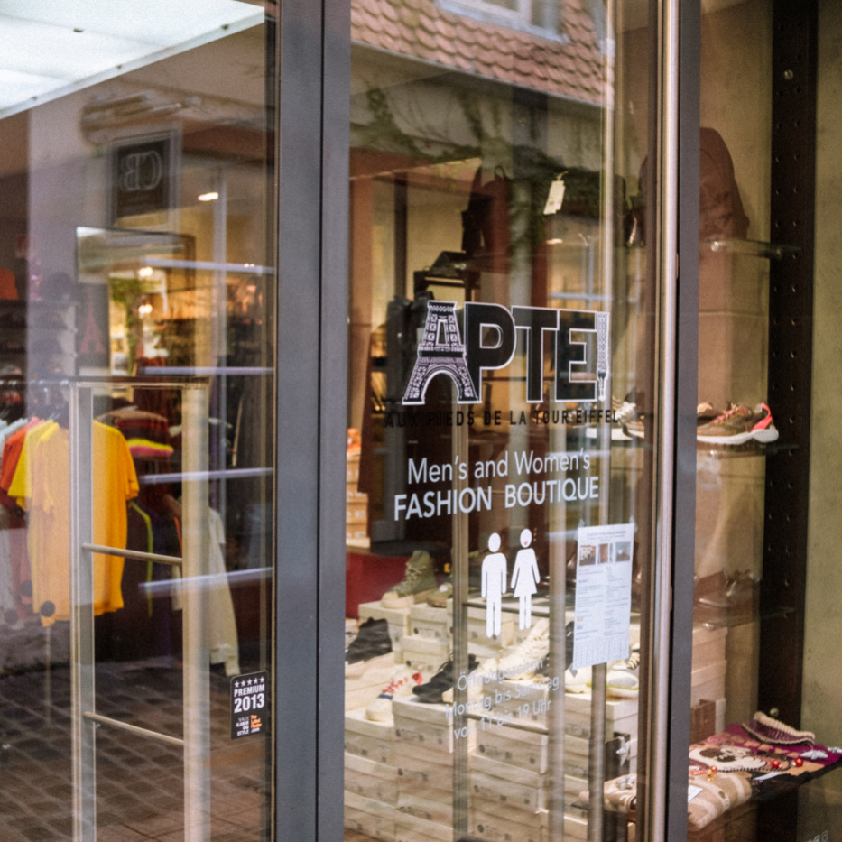 Seit über 20 Jahren ist APTE! der Avantgarde- Laden in Saarbrücken (Fröschengasse) direkt am St. Johanner Markt. Nach einem aufwendigen Umbau findet man auf über 140 qm und auf drei Etage feinste Designerbekleidung. APTE! steht für Mode, die Ihrer Zeit voraus ist und gleichzeitig auch das Zeug zum Klassiker hat.