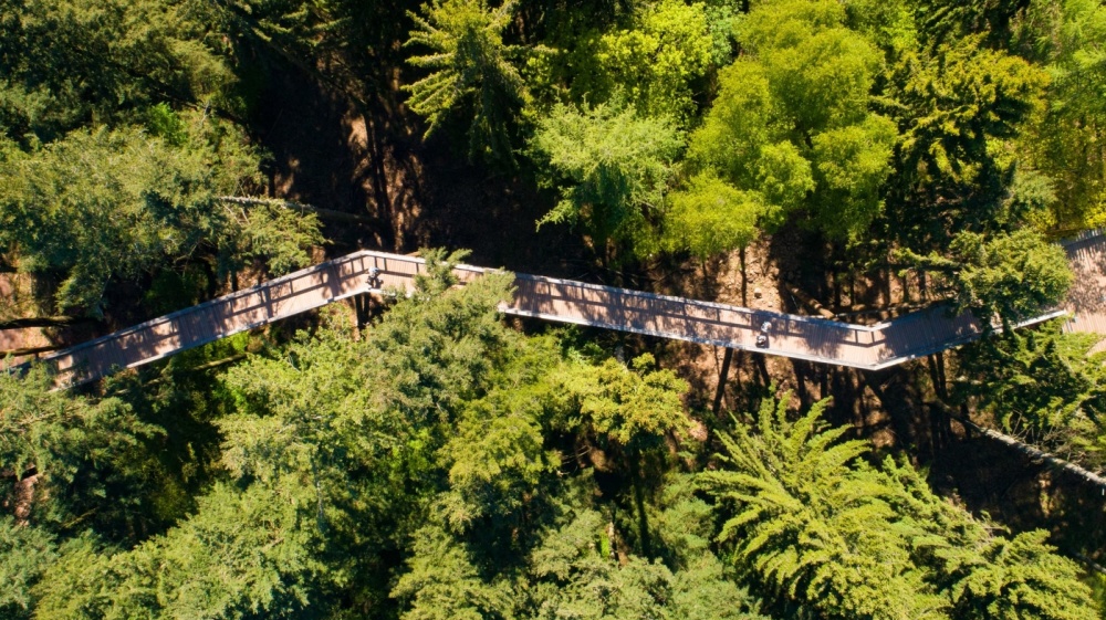 Oberhalb der Cloef schlängelt sich der 1.250 Meter lange barrierearme Baumwipfelpfad durch den Wald und mündet in einen 42 Meter hohen Aussichtsturm. Dort erwartet die Besucher ein unvergessliches Erlebnis: der einzigartige Panoramablick auf die Saarschleife und die umliegende Landschaft.