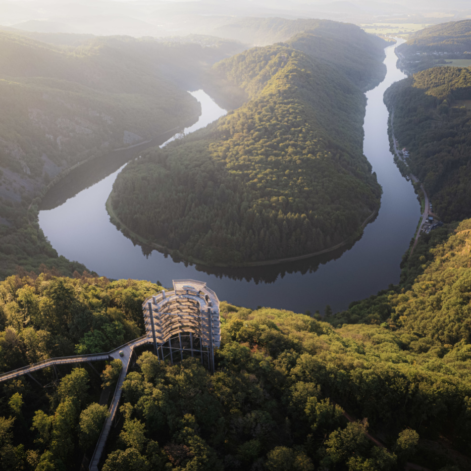 Au-dessus de la Cloef, ce chemin de 1 250 mètres, accessible aux personnes à mobilité réduite, serpente à travers la forêt et mène à une tour d'observation de 42 mètres de haut. Les visiteurs y découvrent une expérience inoubliable : une vue panoramique unique sur la boucle de la Sarre et le paysage environnant.